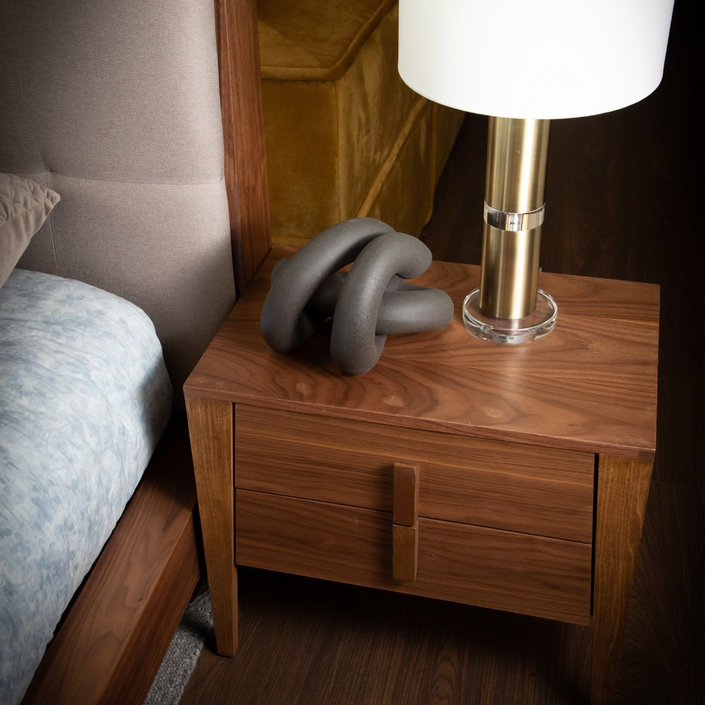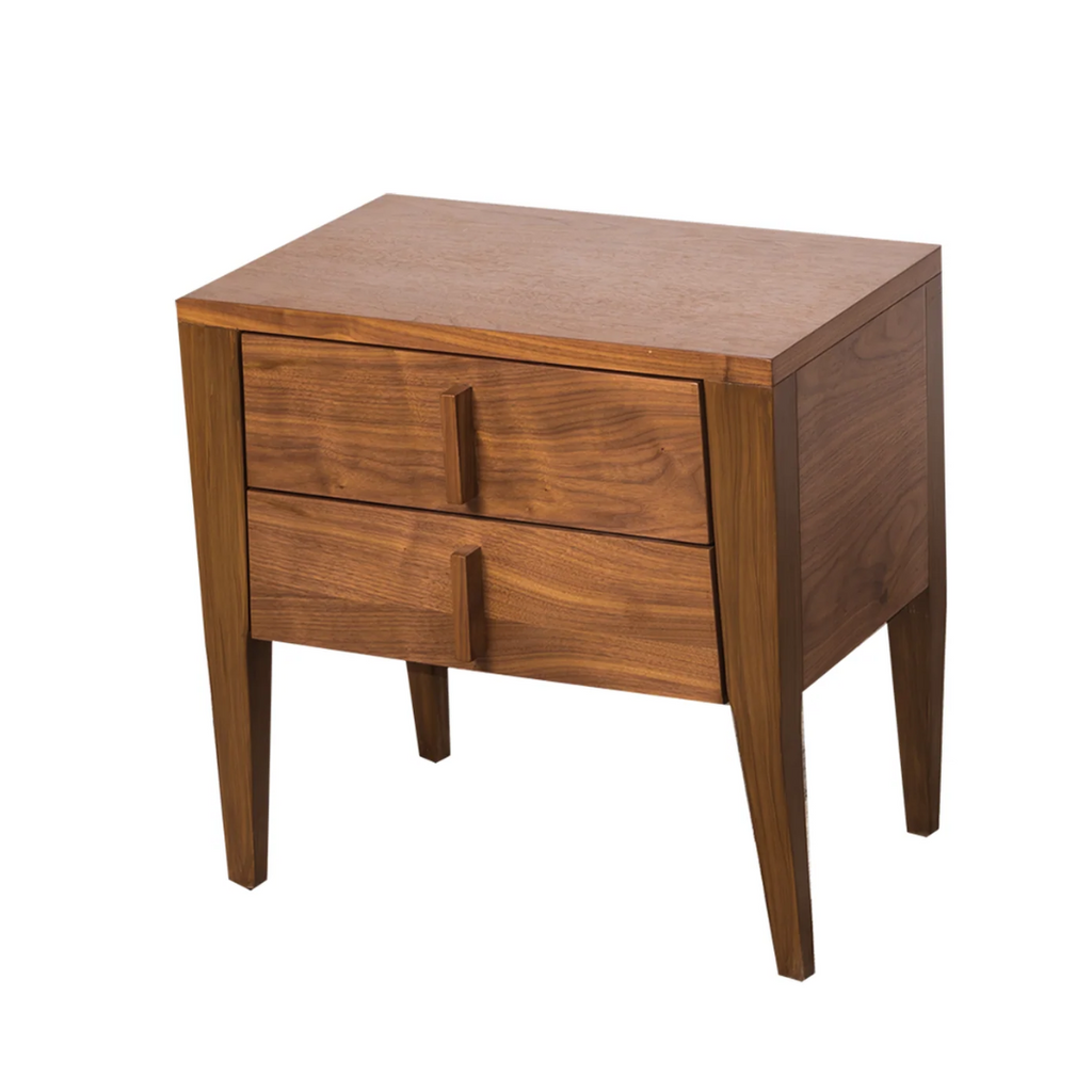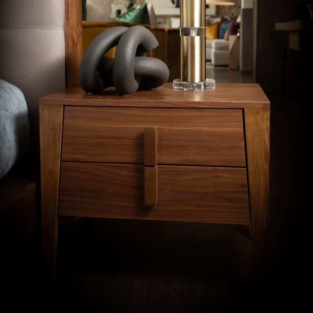 Buró en MDF y acabado en nogal natural con patitas largas que le dan altura y dos cajones.