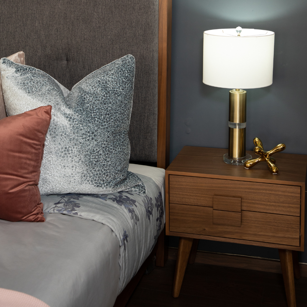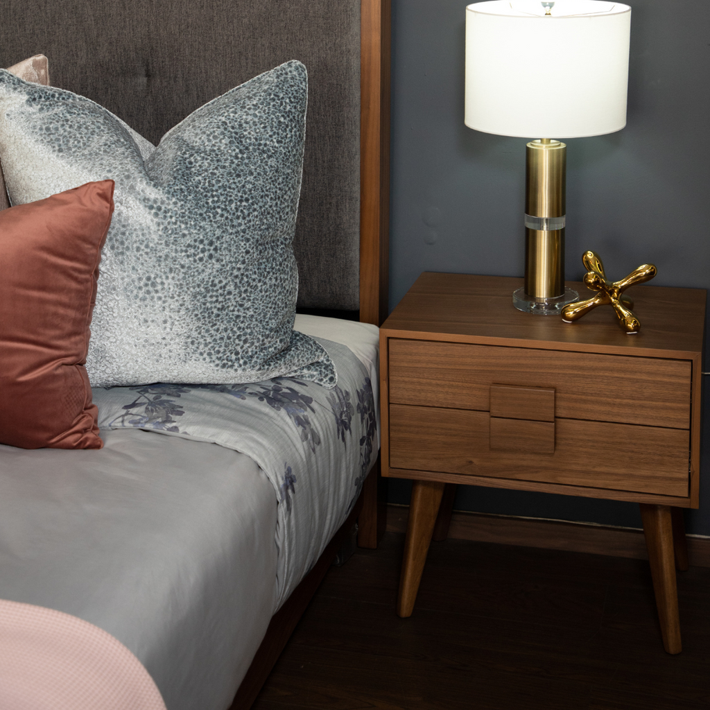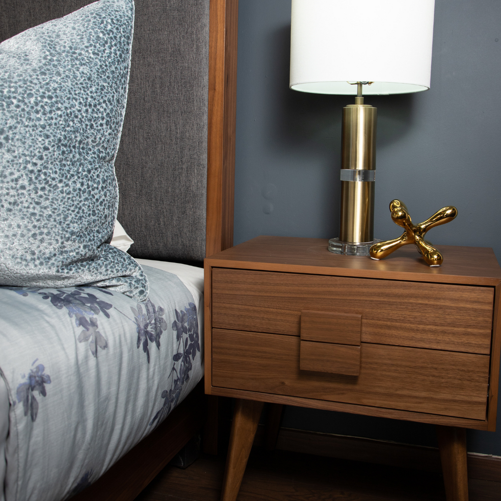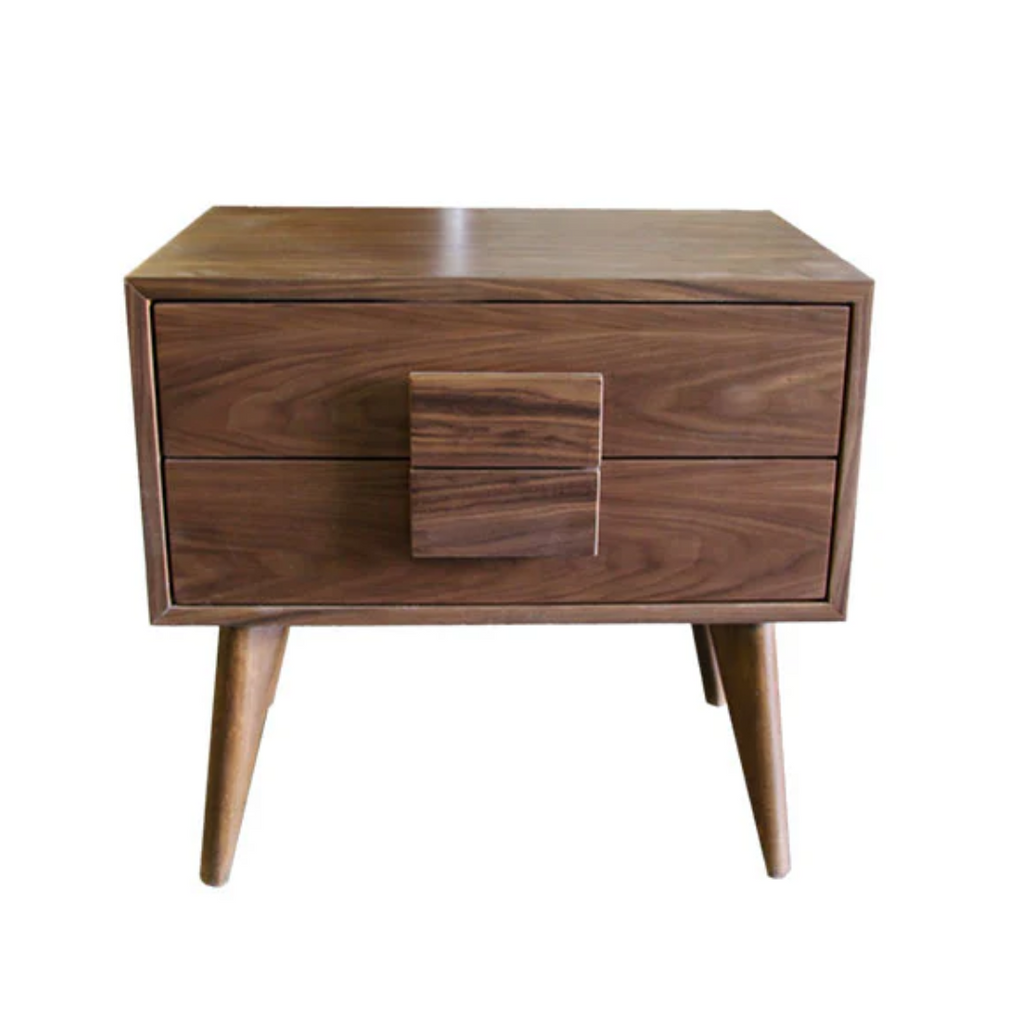 Buró en chapa de nogal con dos cajones y jaladeras de madera.