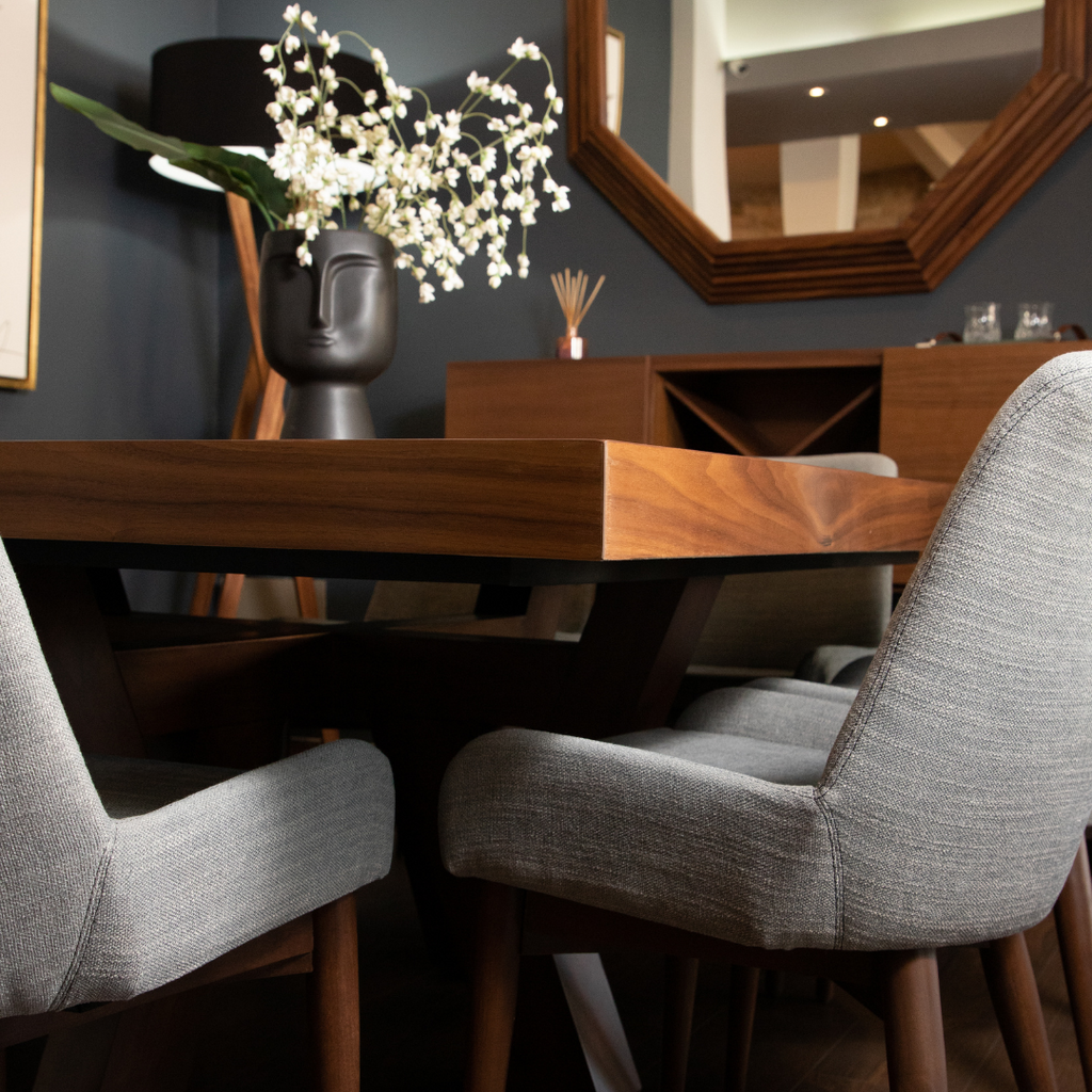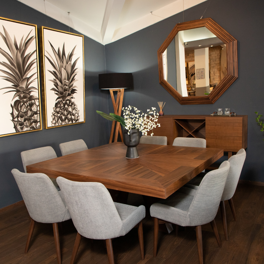 Comedor de MDF y chapa natural de parota. Esta pieza posee texturas que generan una sensación de paz dentro de tu hogar agregando un toque contemporáneo y sencillo al espacio.