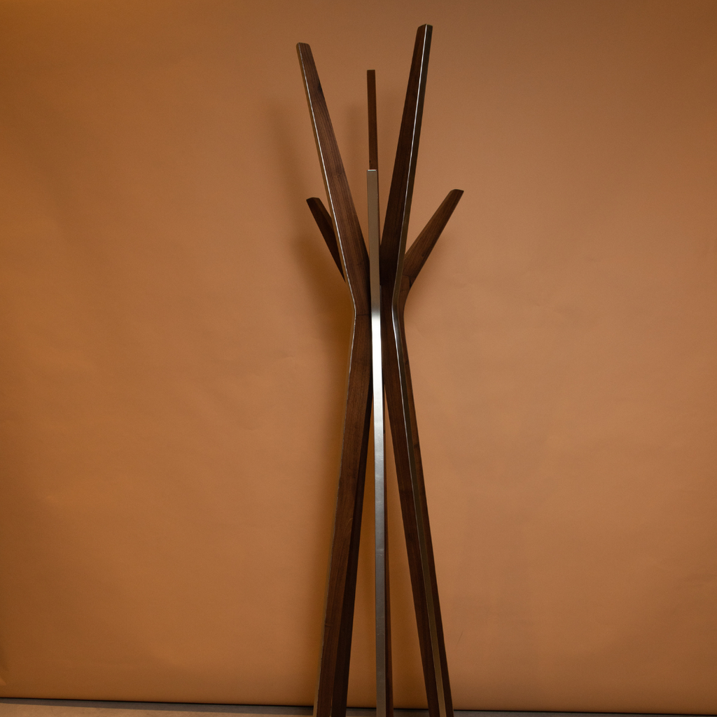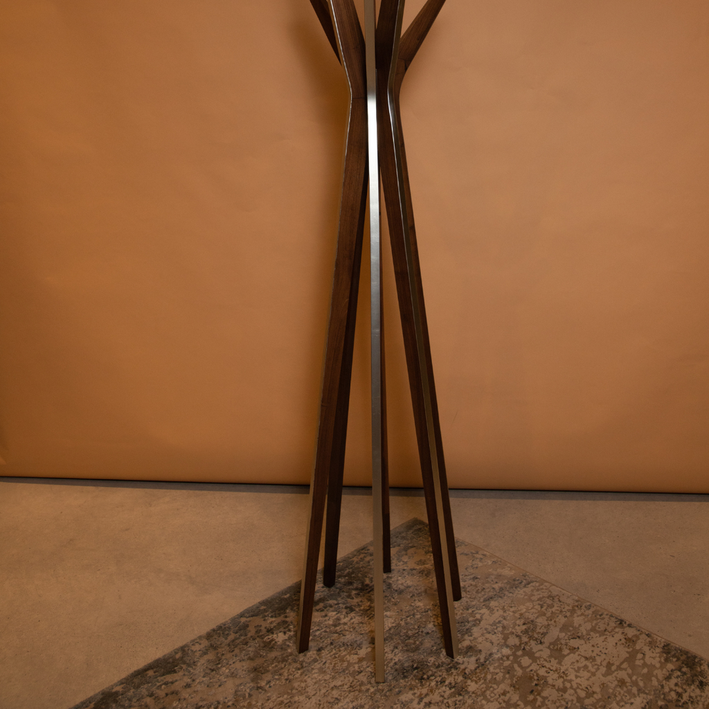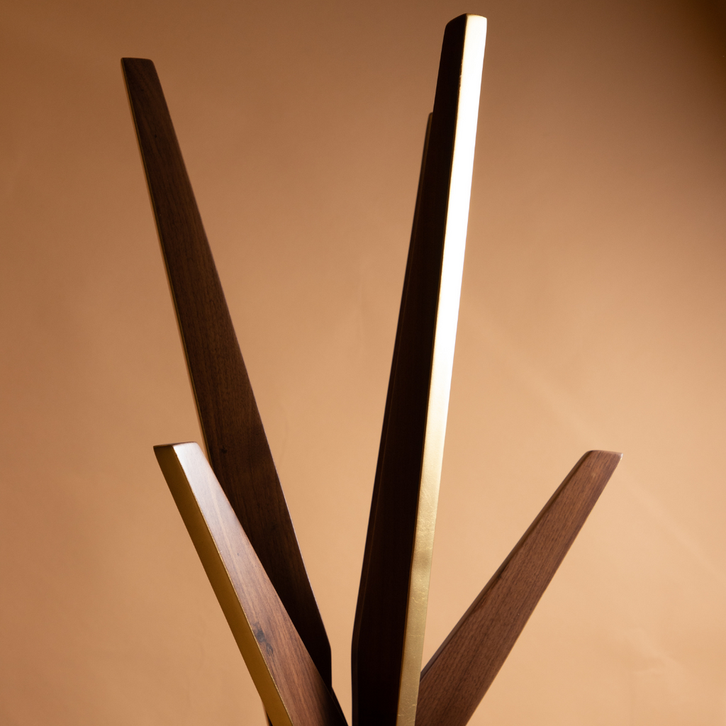 Perchero en madera de nogal sólida con cantos rectos y hoja de oro o plata.