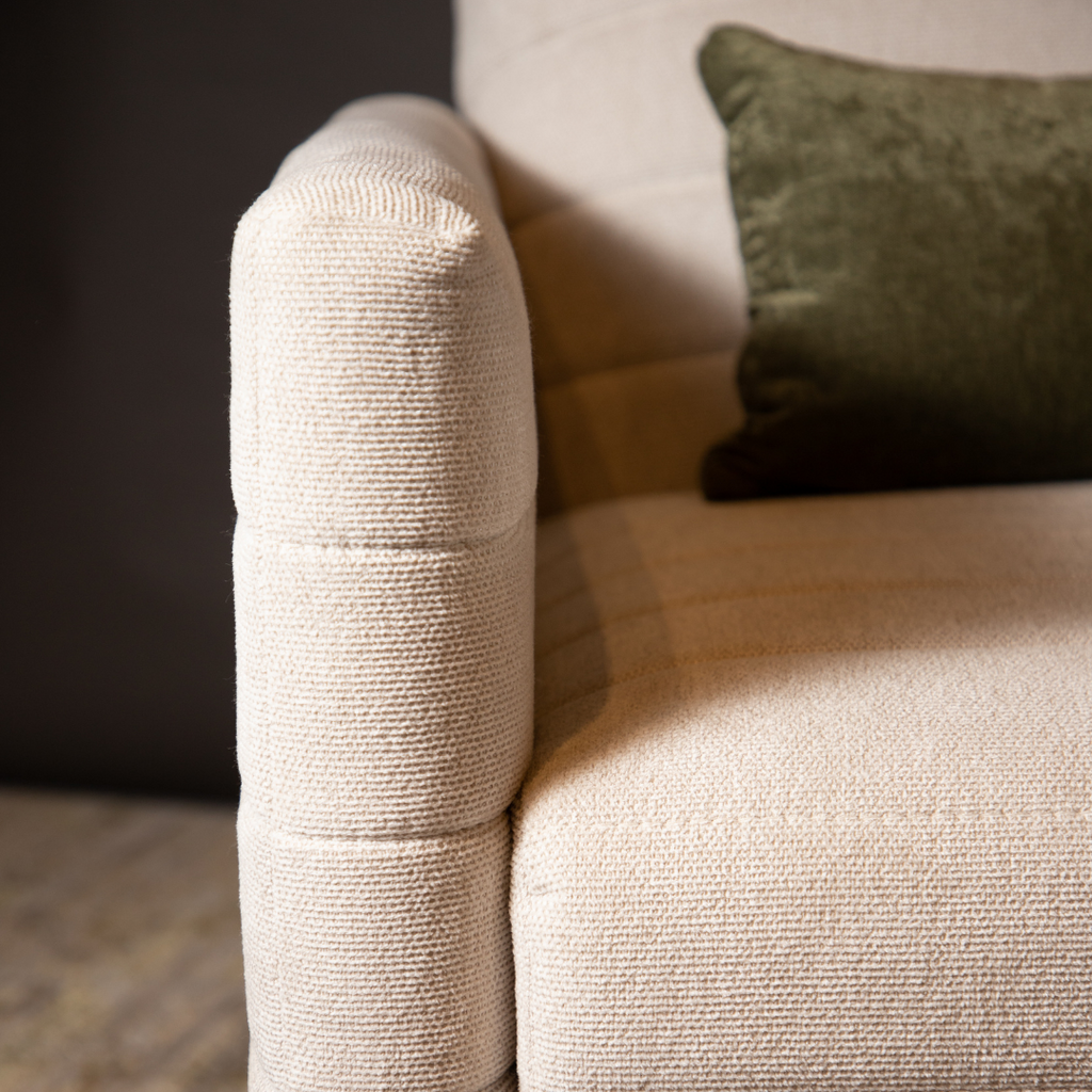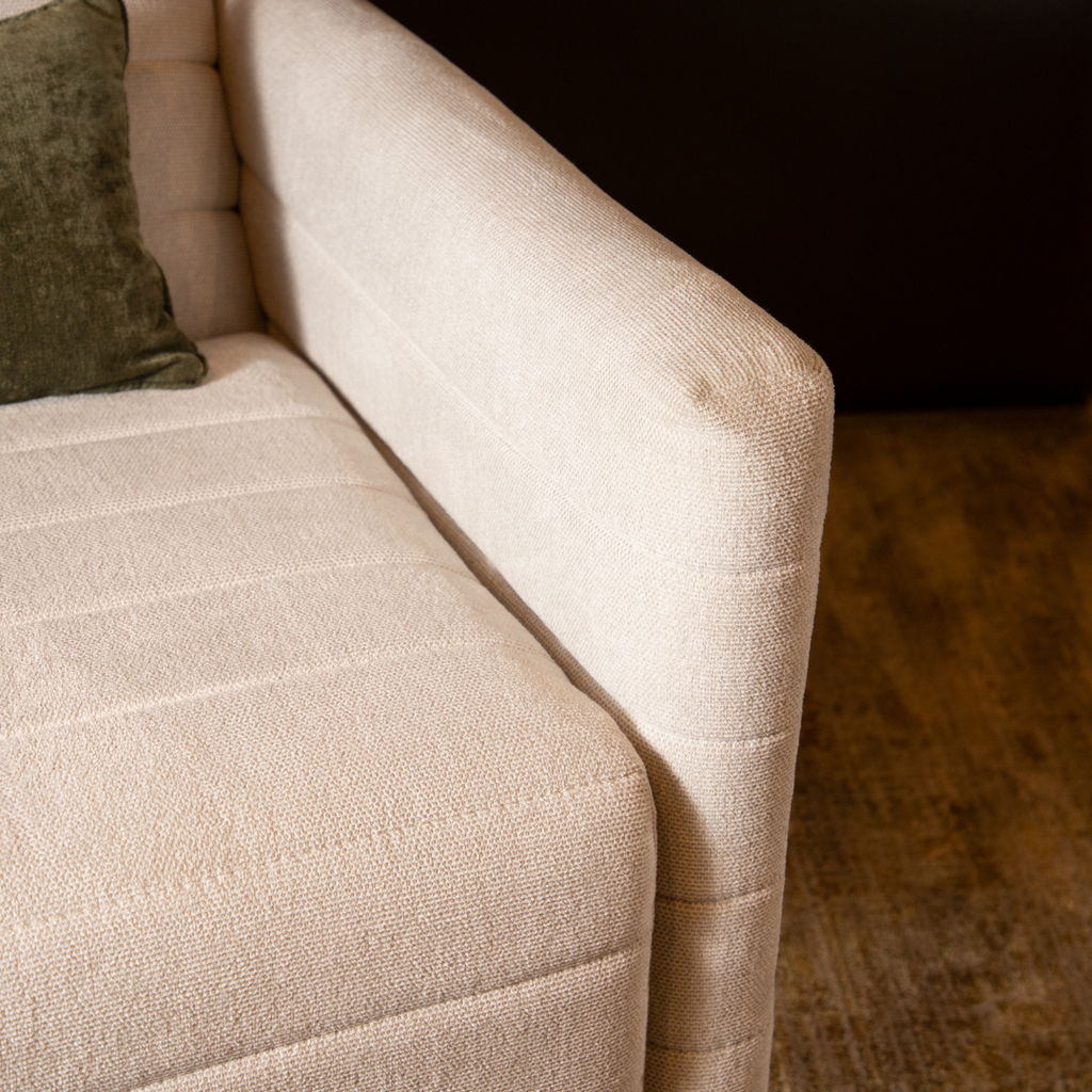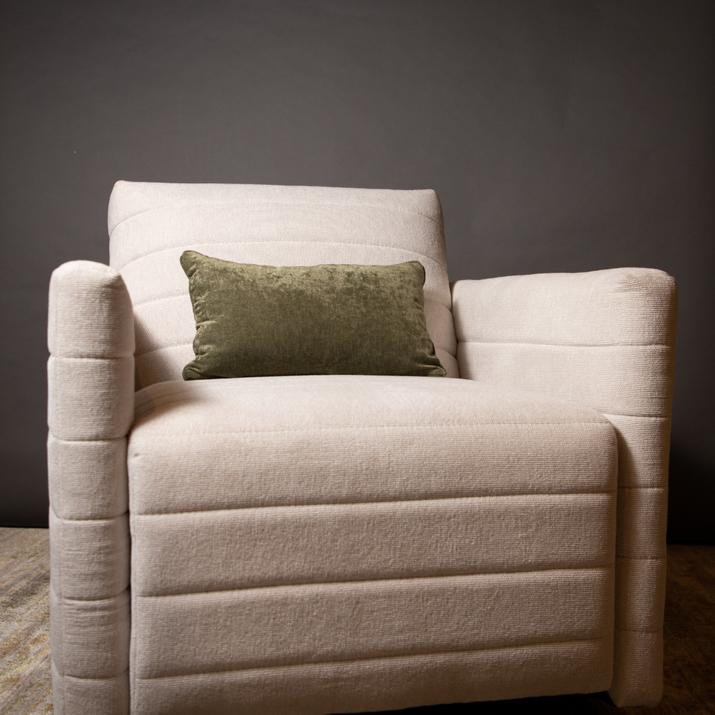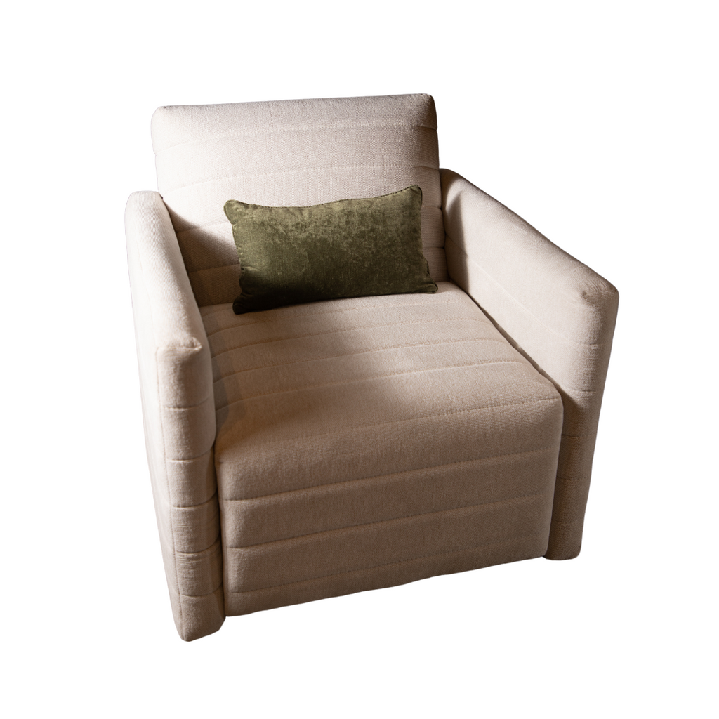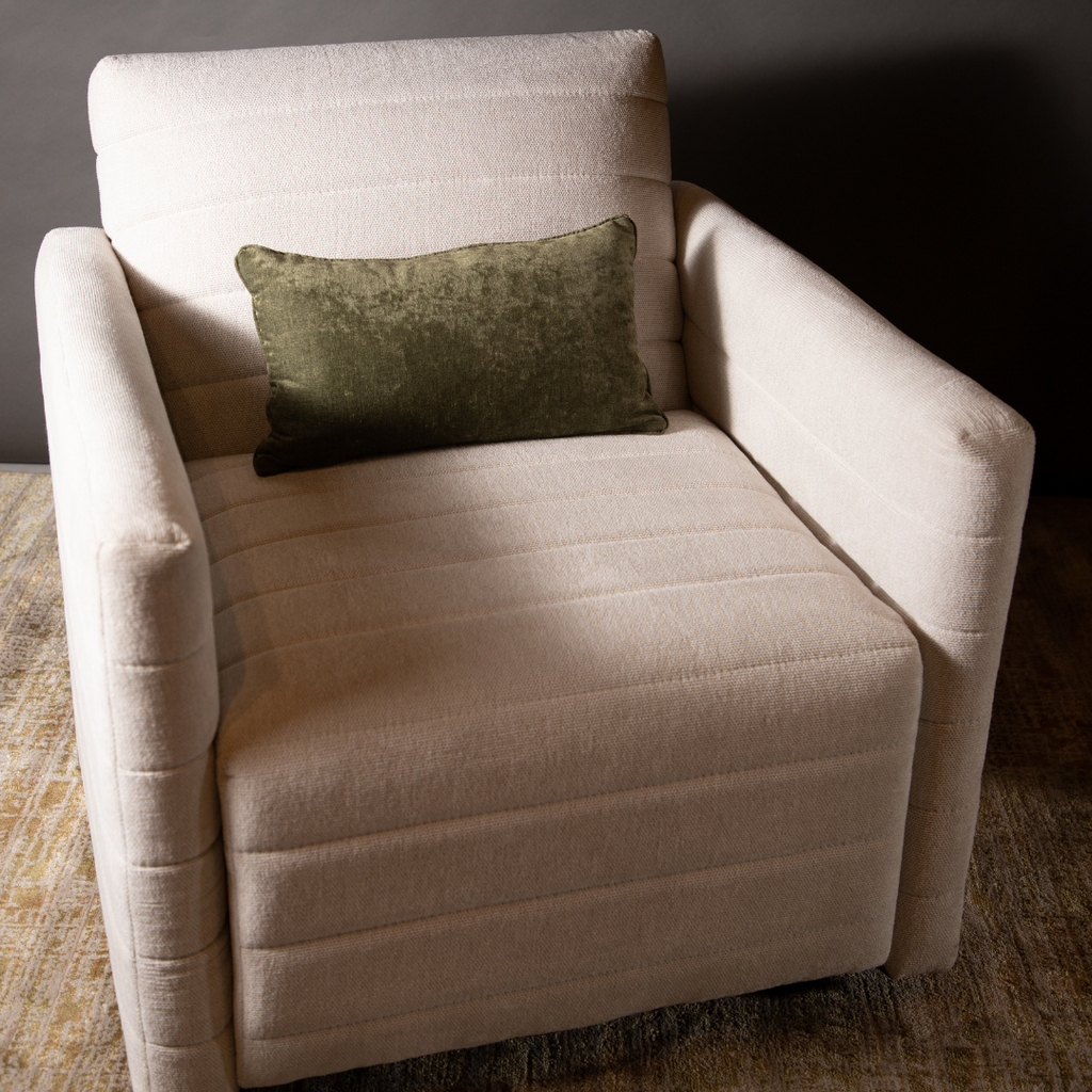 Sillón giratorio en forma cuadrada y descansa brazos altos con líneas verticales tipo oruga en asiento, respaldo y laterales.