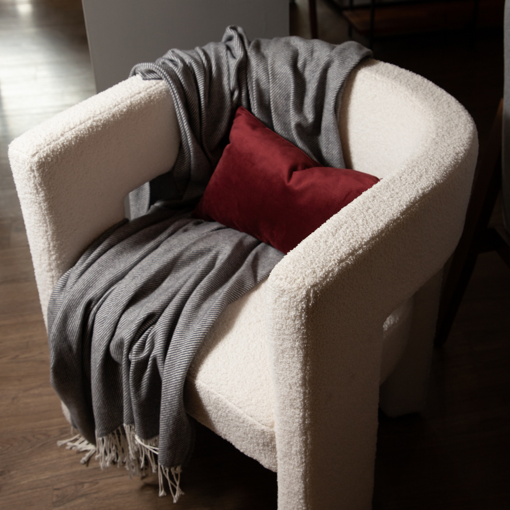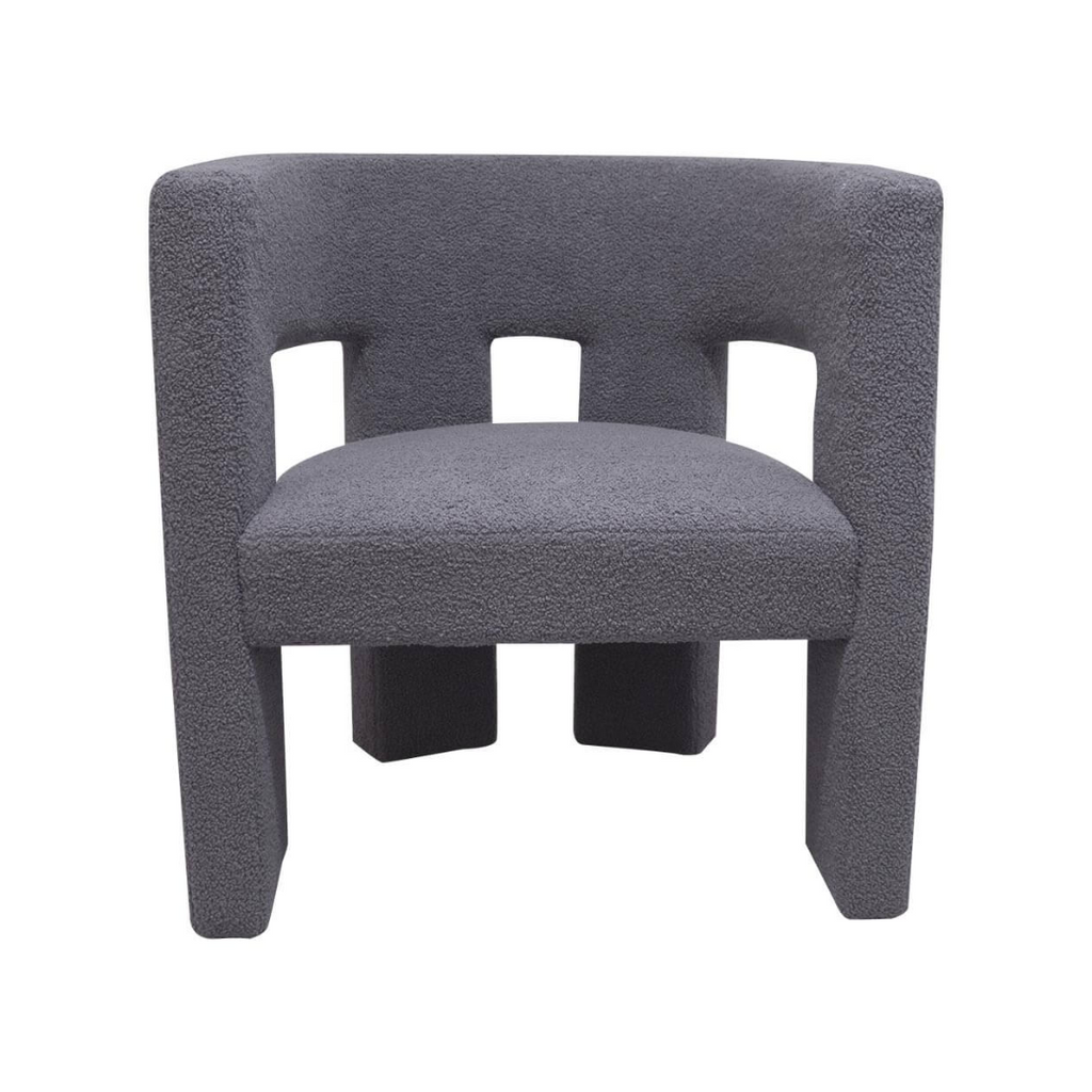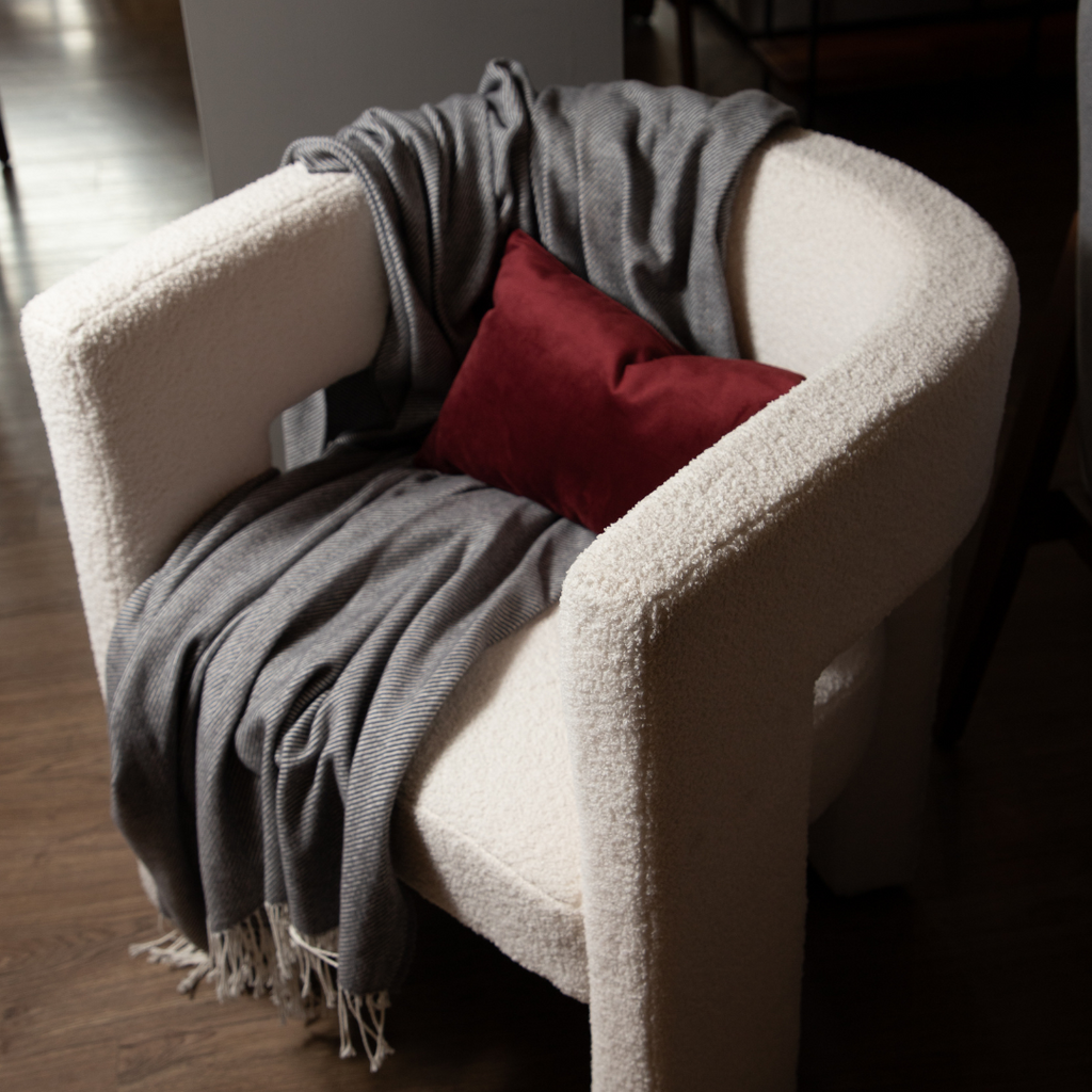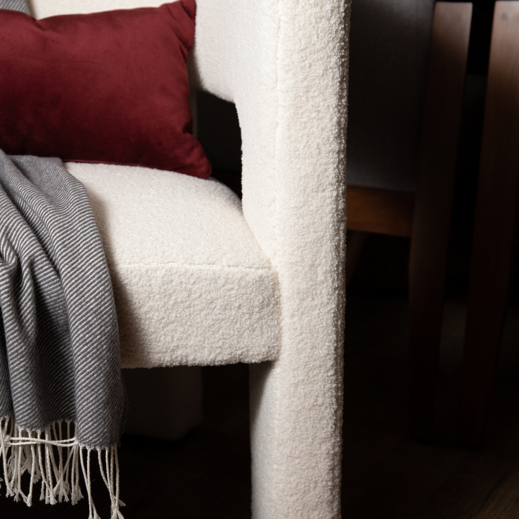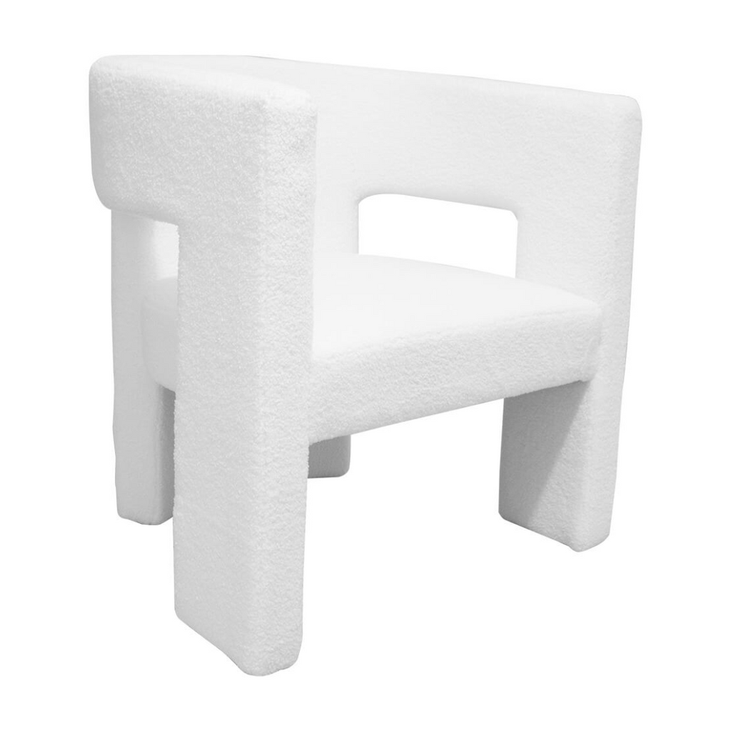 Sillón en diseño moderno tapizado completamente en tela aborrregada tipo bucle.